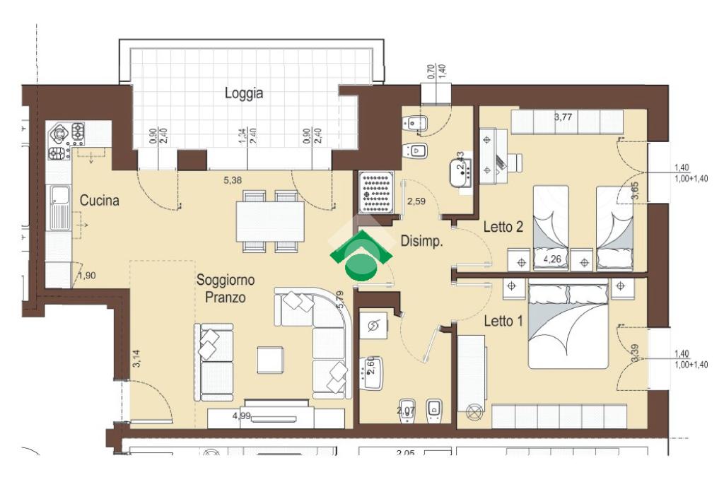 Situato al secondo piano di una palazzina con ascensore di sole otto unità, l'immobile offre un ambiente moderno e confortevole. L'ingresso è diretto nella zona giorno, unico ambiente con cucina a vista di ampia metratura con accesso diretto al terrazzo con affaccio sul parco. Nel reparto notte sono presenti due camere da letto matrimoniali e due bagni.