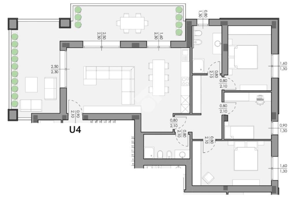 L'appartamento che qui vi presentiamo è posto al 2° piano e gode di tre lati liberi con esposizione nord-est-sud. L'ingresso è diretto nella generosa zona giorno, luminoso ambiente open-space di circa 40 mq. che si affaccia sul terrazzo di quasi 40 mq. in parte loggiato, ideale da sfruttare con la propria famiglia e amici nei mesi caldi. Nel reparto notte sono presenti due camere da letto matrimoniali, una comoda camera da letto singola e due bagni dotati di doccia. Completano questa proposta al piano terra il garage per un'auto dotato di portone sezionale automatizzato e il posto auto scoperto ubicato all'interno della zona comune.