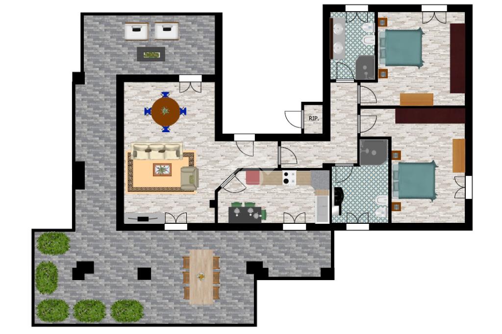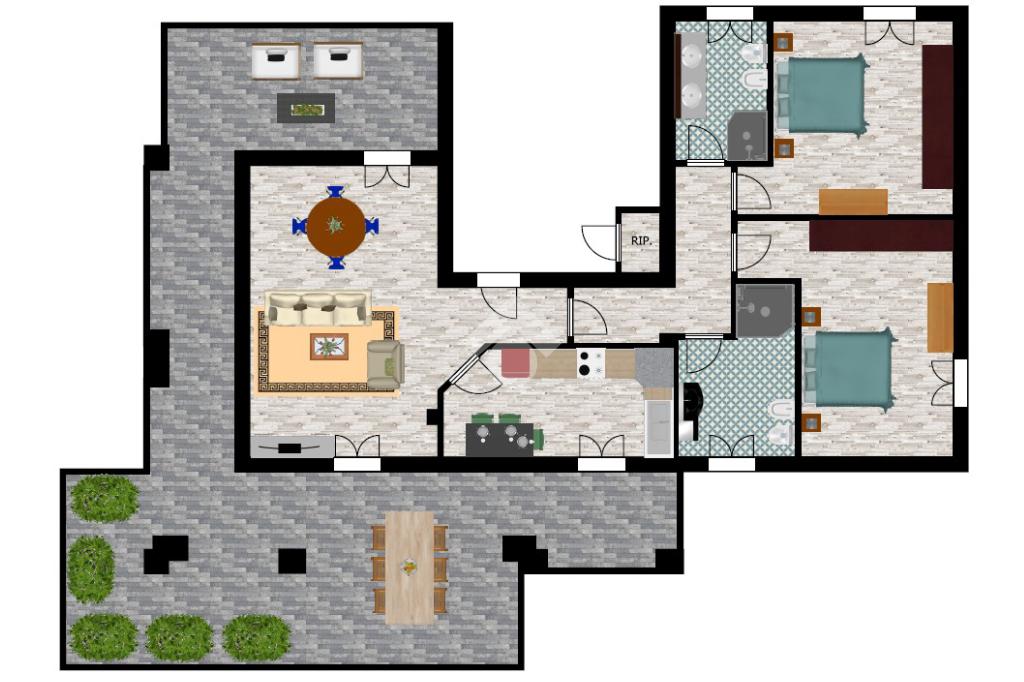 Internamente l'abitazione prevede l'ingresso sul soggiorno, ambiente che permette di creare una zona pranzo e una zona relax con doppia uscita sul terrazzo. La cucina è separata dal soggiorno e dalla quale si può accedere al terrazzo. Nel reparto notte sono distribuite le due camere da letto matrimoniali e i due bagni finestrati dotati di doccia.