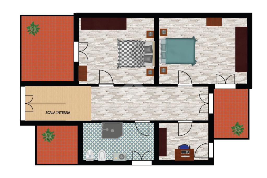 Attraverso la scala interna si raggiunge il livello superiore, ovvero la zona notte, dove sono presenti due grandi camere da letto matrimoniali che dispongono ognuna di un accesso ad un terrazzo, uno studio, perfetto per chi necessita di uno spazio dedicato al lavoro o allo studio, e un bagno dotato di doccia.