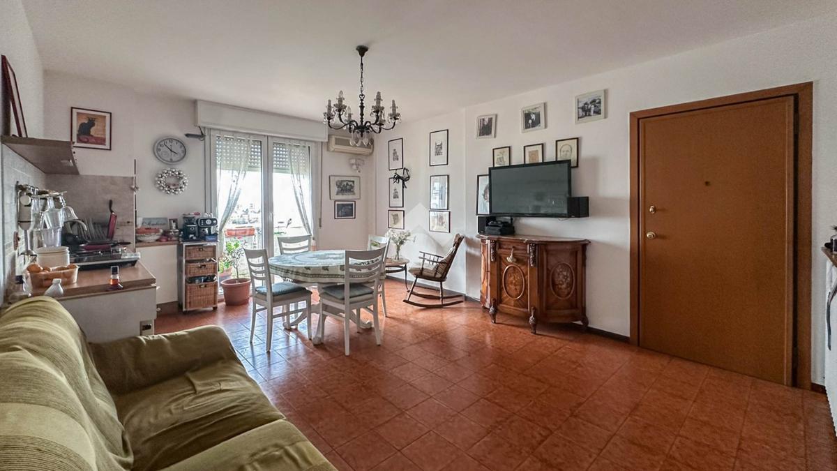 L'immobile, nelle sue condizioni originarie ad eccezione del bagno rinnovato nell'anno 2013 e di nuove finestre in PVC, offre una ampia e luminosa zona giorno con accesso diretto a un balcone e due camere da letto, perfette per una famiglia o per chi desidera uno spazio aggiuntivo per ospiti o studio.