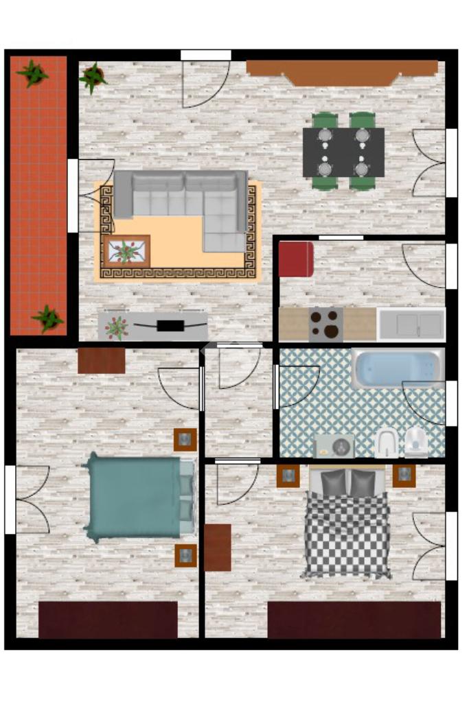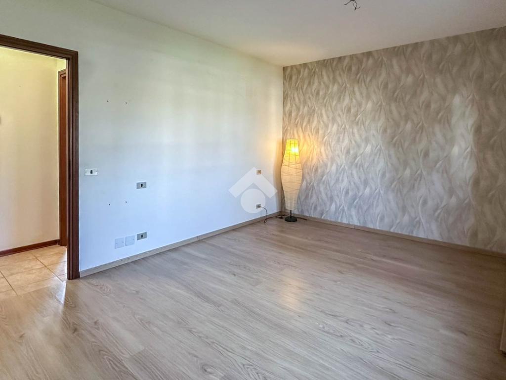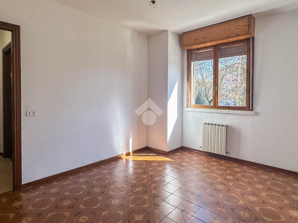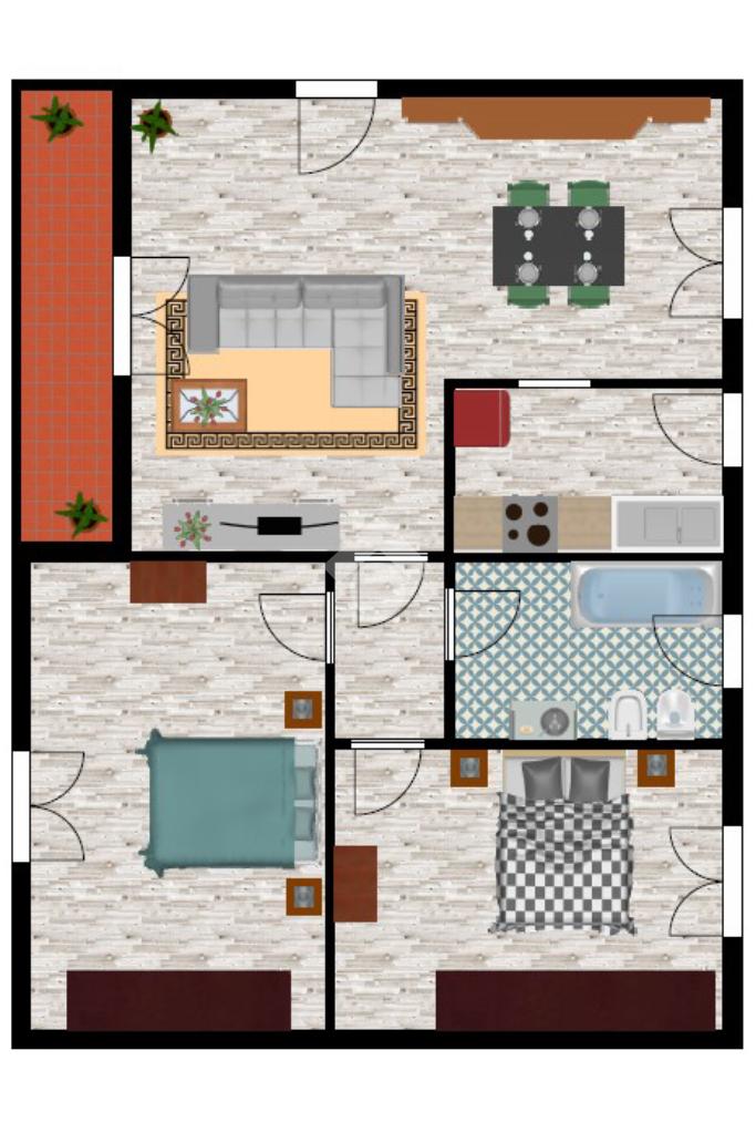 L'appartamento è composto di soggiorno con doppio affaccio e balcone, cucinotto, due camere da letto matrimoniali e bagno con vasca.