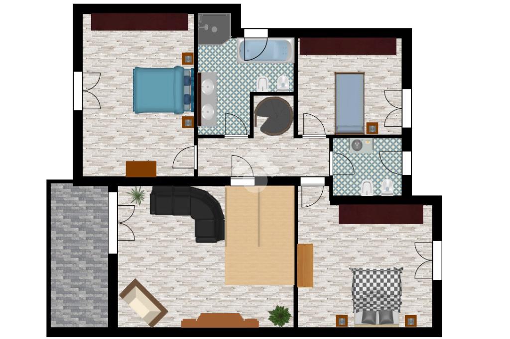 Al piano terra la zona giorno sviluppa un importante soggiorno di oltre 40 mq. con cucina a vista, studio o camera da letto e bagno di servizio. Salendo verso il reparto notte, nell'ammezzato, è presente un confortevole spazio adibito a salotto con camino. Raggiunto il reparto notte, si trovano due ampie camere matrimoniali, una cameretta, una sala da bagno con vasca e doccia, un secondo bagno e una scala a chiocciola che permette di raggiungere una soffitta ampiamente sfruttabile come studio o salottino.